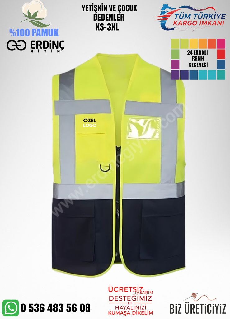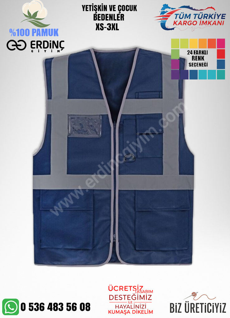Toptan lacivert mühendis yelek üreticisi Erdinç Giyim, şantiye, saha ve teknik çalışma alanlarında görev yapan mühendis ve personeller için yüksek kaliteli mühendis yelekleri üretir. Ucuz, orta ve yüksek kalite seçenekleriyle reflektörlü, dayanıklı ve çok cepli modeller sunuyoruz. Baskılı veya nakışlı logo uygulamalarıyla tamamen firmanıza özel üretim yapılır.