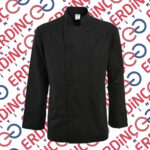 Şık tasarımlı siyah şef ceketi, mutfak çalışanları için konforlu ve şık çözüm.
